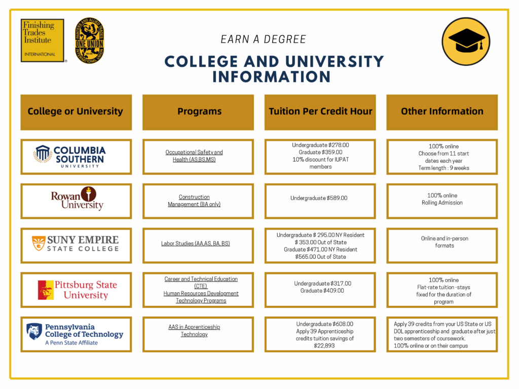Currently, iFTI has partnerships with Empire State College, Columbia Southern State University, Rowan University, and Pittsburg State University to continue Associate (AS), Bachelor (BS), and Master (MS) degree programs in Labor Studies, Occupational Health and Safety, and Workforce Development. These partnerships and programs are designed for working tradespeople. Discover flexible learning options, credit for your apprenticeship and prior experience, and support every step of the way as you earn your degree.