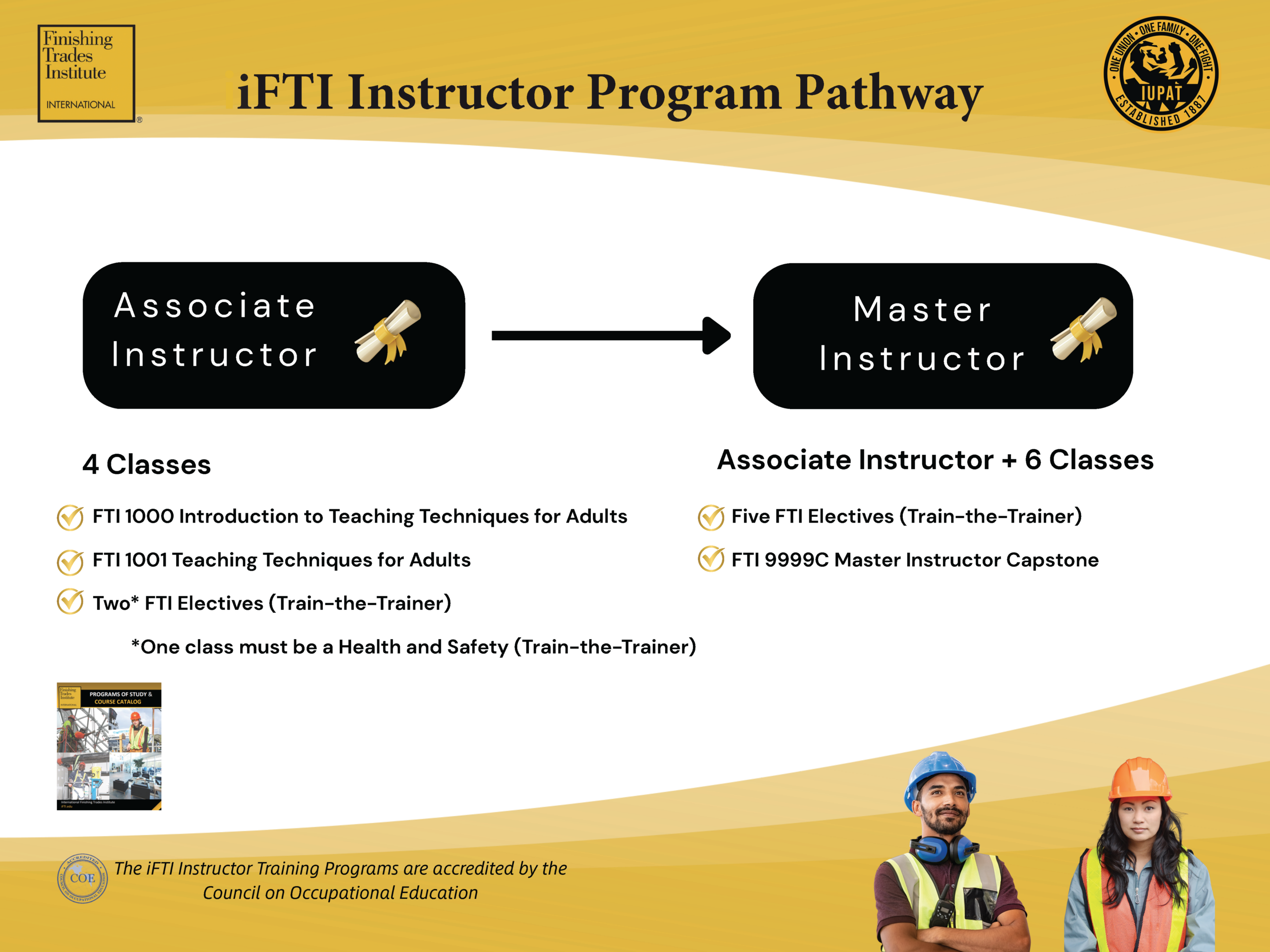The International Finishing Trades Institute (iFTI) offers a structured, COE-accredited Instructor Training Program designed to develop high-quality instructors across the IUPAT. The program includes two progressive levels: Associate Instructor and Master Instructor.